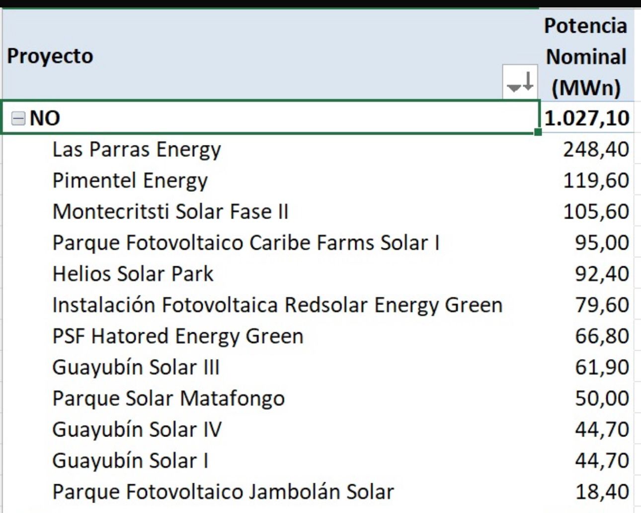 The list also comprises Instalación Fotovoltaica Redsolar Energy Green (79.60 MW), PSF Hatored Energy Green (66.80 MW) and Guayubín Solar III (61.90 MW), alongside Parque Solar Matafongo (50.00 MW), Guayubín Solar IV (44.70 MW), Guayubín Solar I (44.70 MW) and Parque Fotovoltaico Jambolán Solar (18.40 MW).