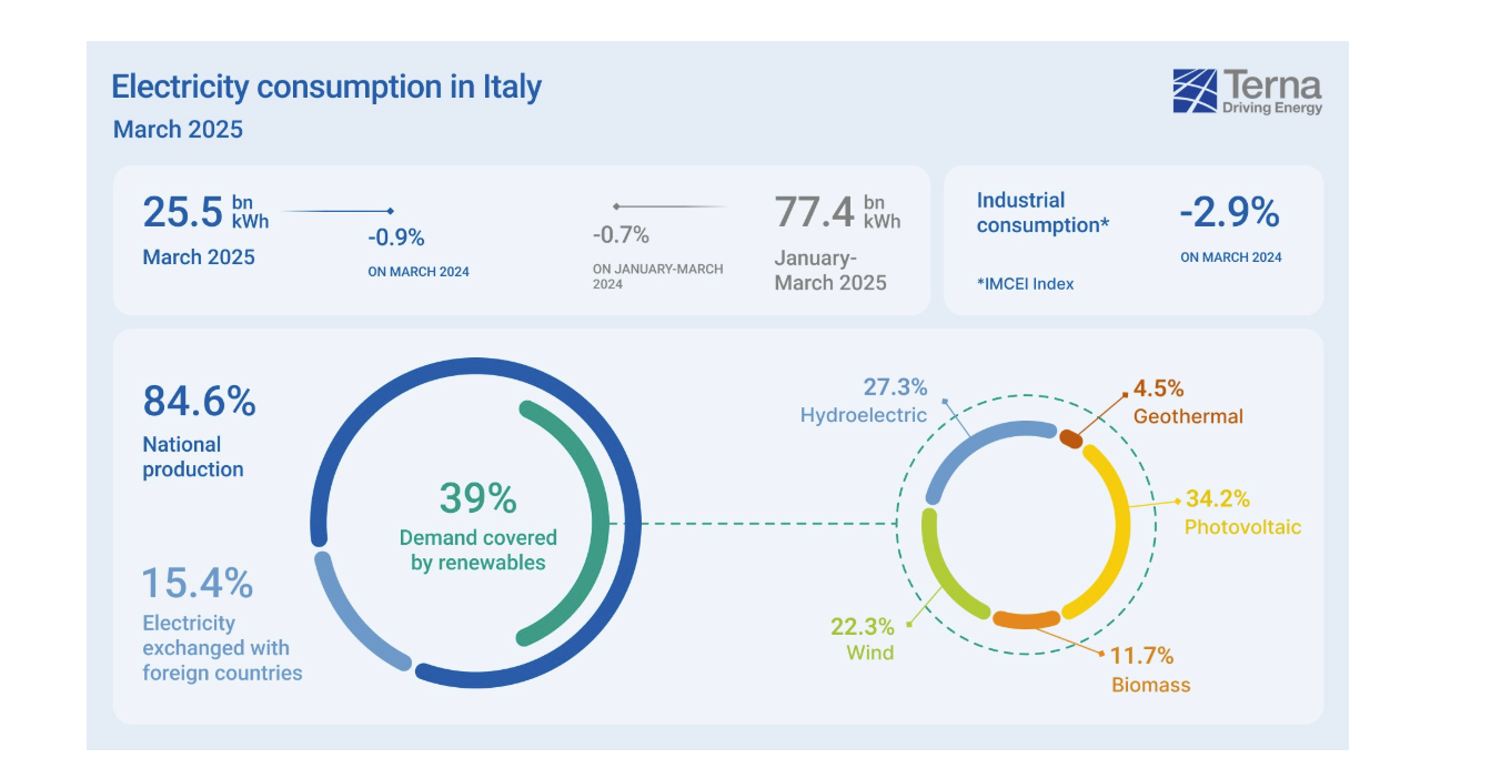 According to data from Terna, the Italian national grid operator, in March the country’s electricity demand amounted to 25.5 billion kWh, marking a decrease of 0.9% compared to the same month in 2024. Specifically, March 2025 had the same number of working days as March 2024 (21), and the average monthly temperature was about 1°C lower, although still higher than the ten-year monthly average. The seasonally and temperature-adjusted variation stood at -1.5%.