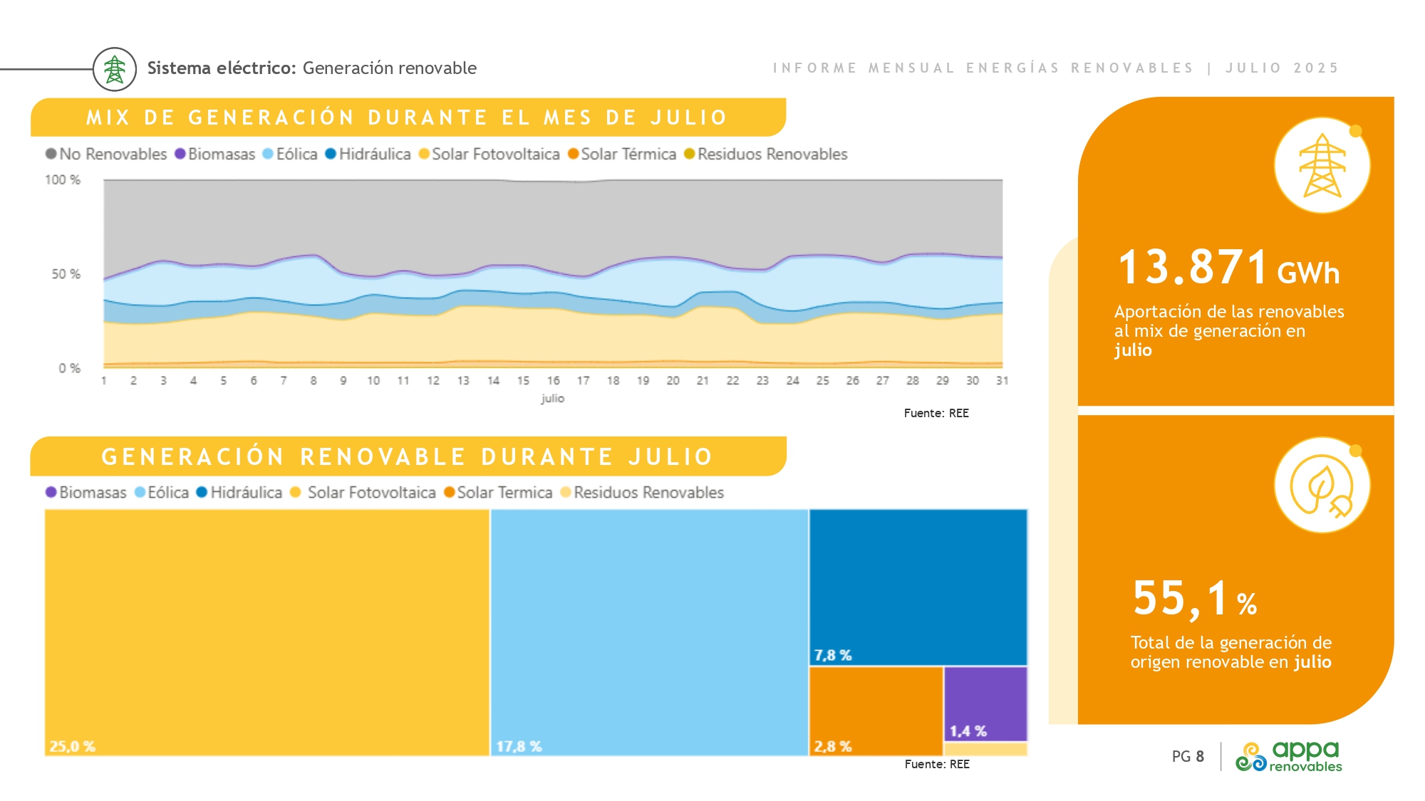 APPA Renovables’ monthly report for July 2025 highlights a milestone in the penetration of clean energy in Spain. During the month, renewable generation reached 13,871 GWh, representing 55.1% of the national electricity mix.