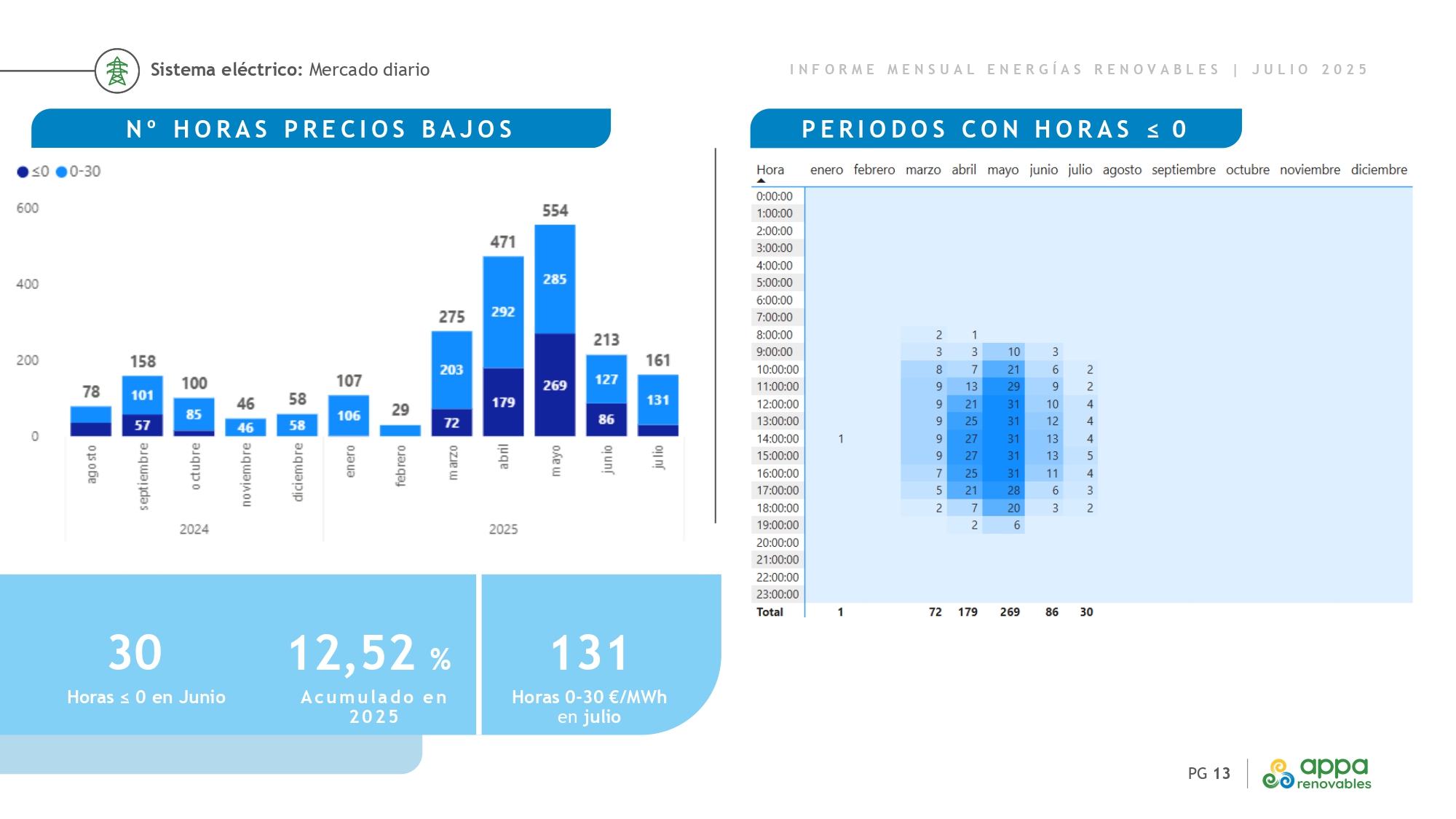 The report also highlights that July saw 30 hours with zero or negative prices, representing 12.52% of all hours in 2025 so far. In addition, there were 131 hours with very low prices, between €0 and €30/MWh, reflecting the strong pressure exerted by renewables on the wholesale market.