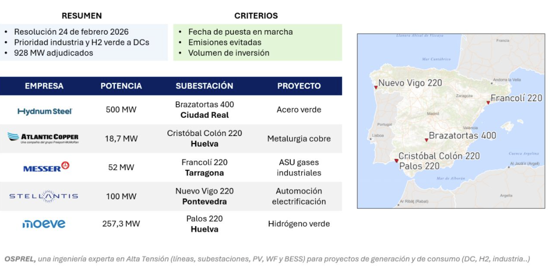 Among the most notable projects are Hydnum Steel, which secured 500 MW for its green steel initiative in Puertollano; Moeve, with 257.3 MW linked to the Andalusian Green Hydrogen Valley; the electrification of Stellantis’ automotive plant in Vigo, as well as industrial developments promoted by Atlantic Copper and Messer.