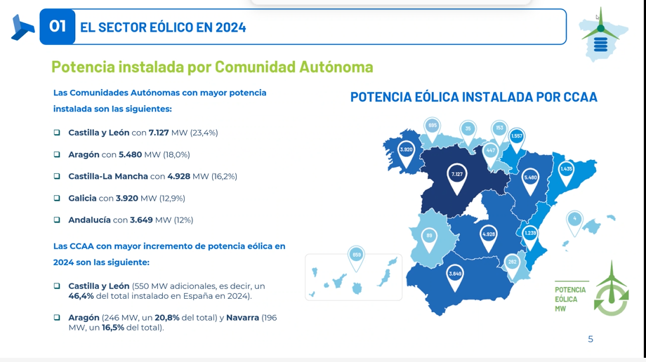 Against this backdrop, new wind capacity deployment remains highly concentrated in a small number of regions. In 2024, Castilla y León (550 MW), Aragón (246 MW) and Navarra (196 MW) accounted for 83% of newly installed capacity.