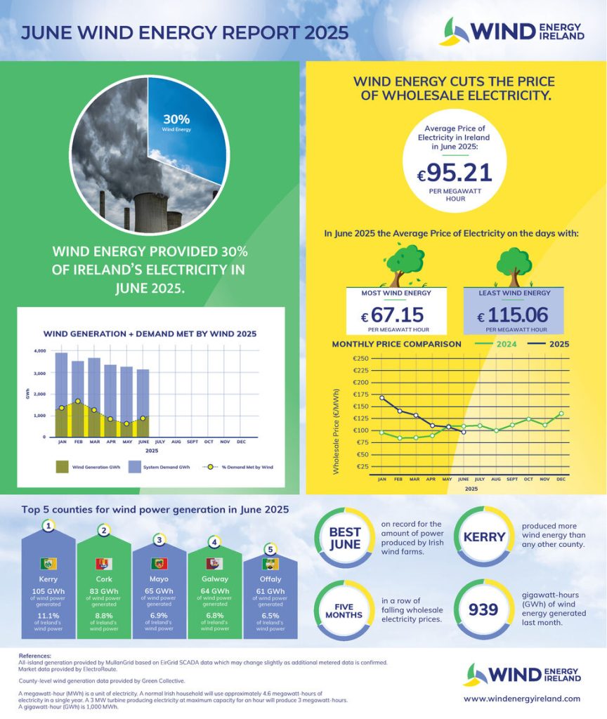 Noel Cunniffe, CEO of Wind Energy Ireland, said: “Our members provided nearly a third of Ireland’s electricity during the first half of 2025 and last month was a particularly strong June month for renewable energy generation.